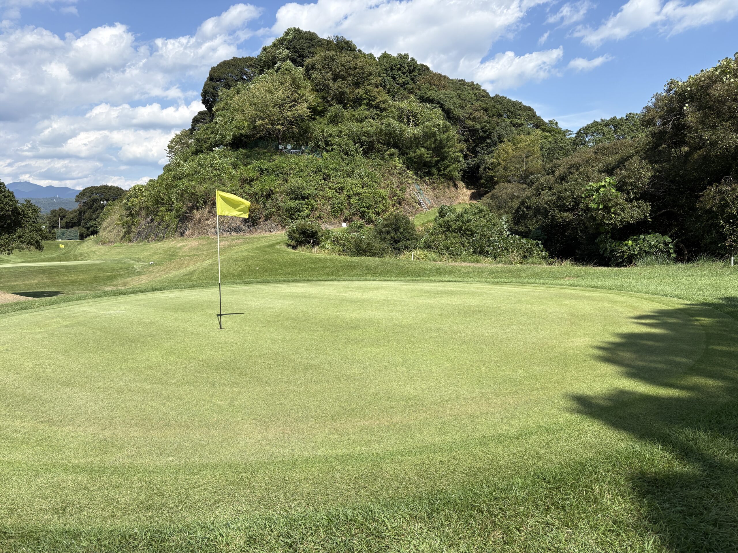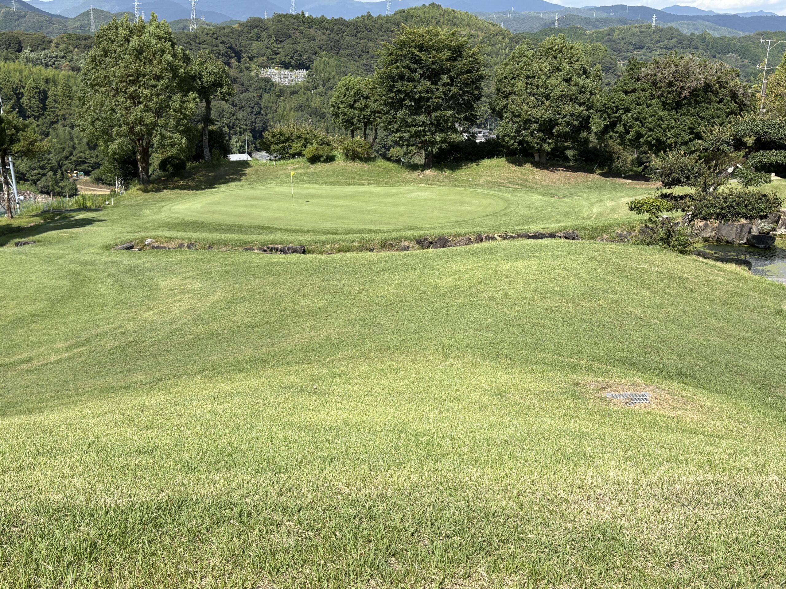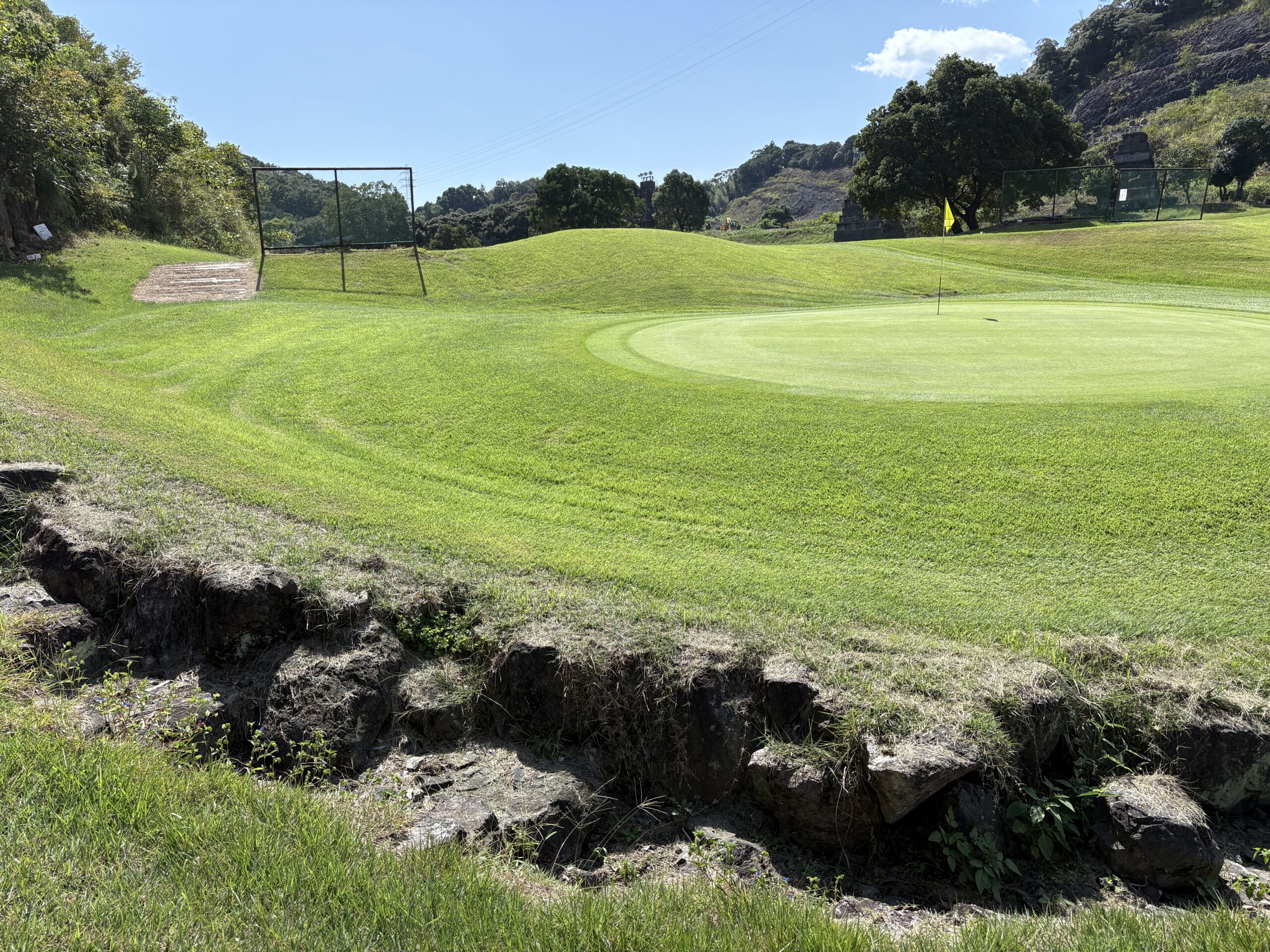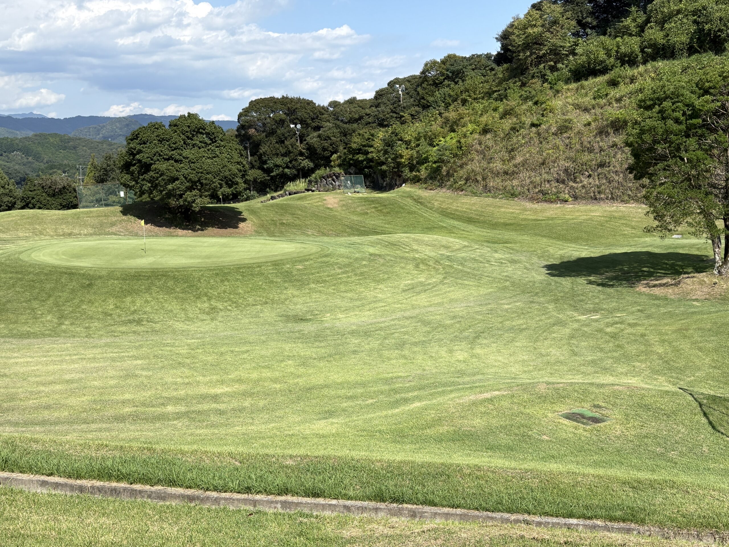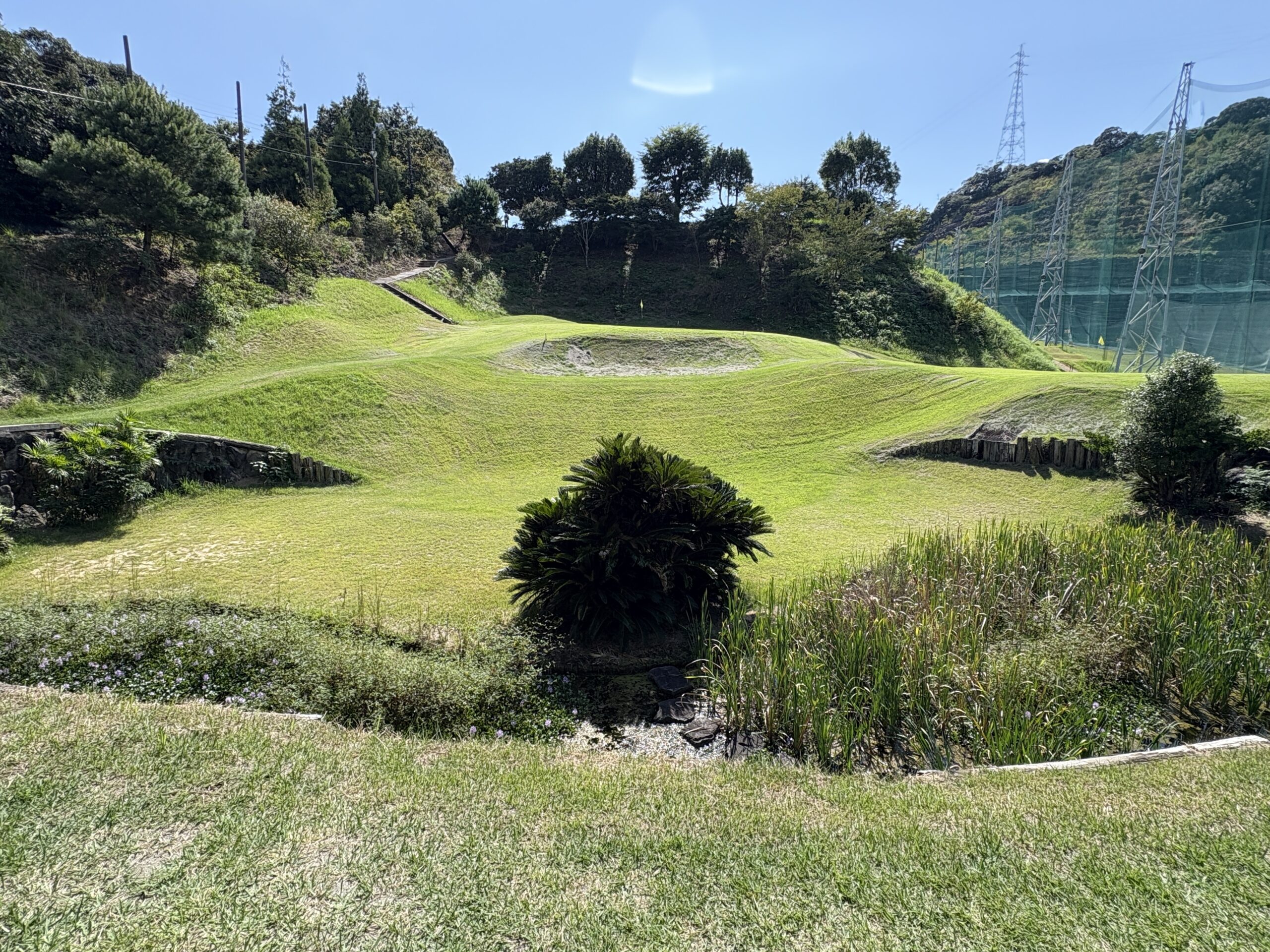 前を横切るクリーク(小川)が、プレーヤーの集中力を試す。左は山裾でOB、右は広く逃げ場がある。クリークをしっかりと越え、ピン手前から攻める冷静さがスコアを左右する。