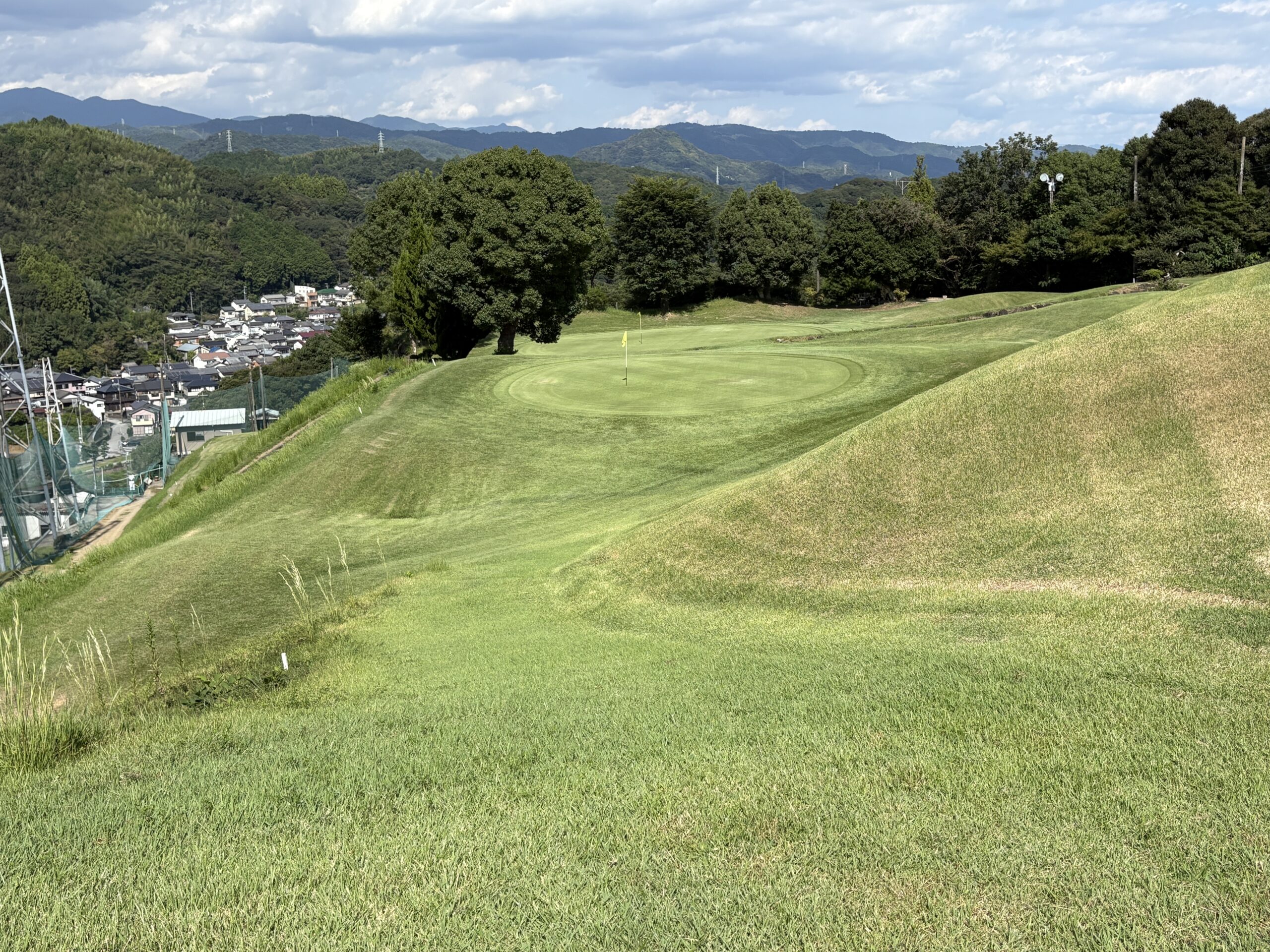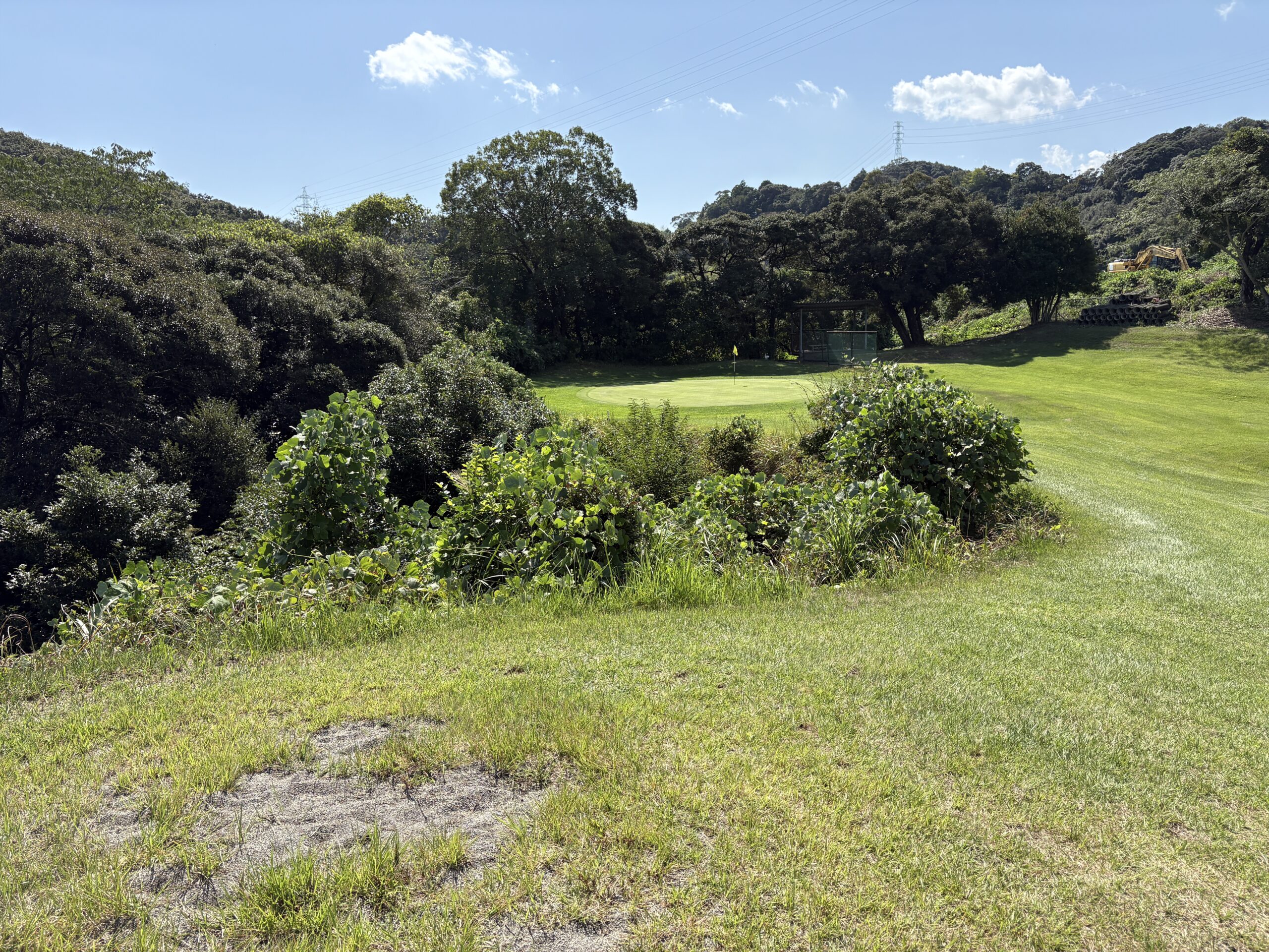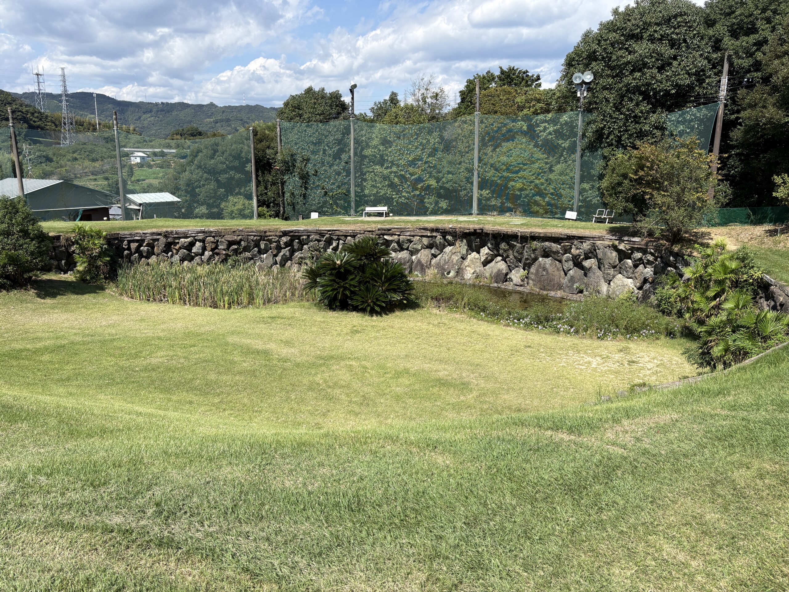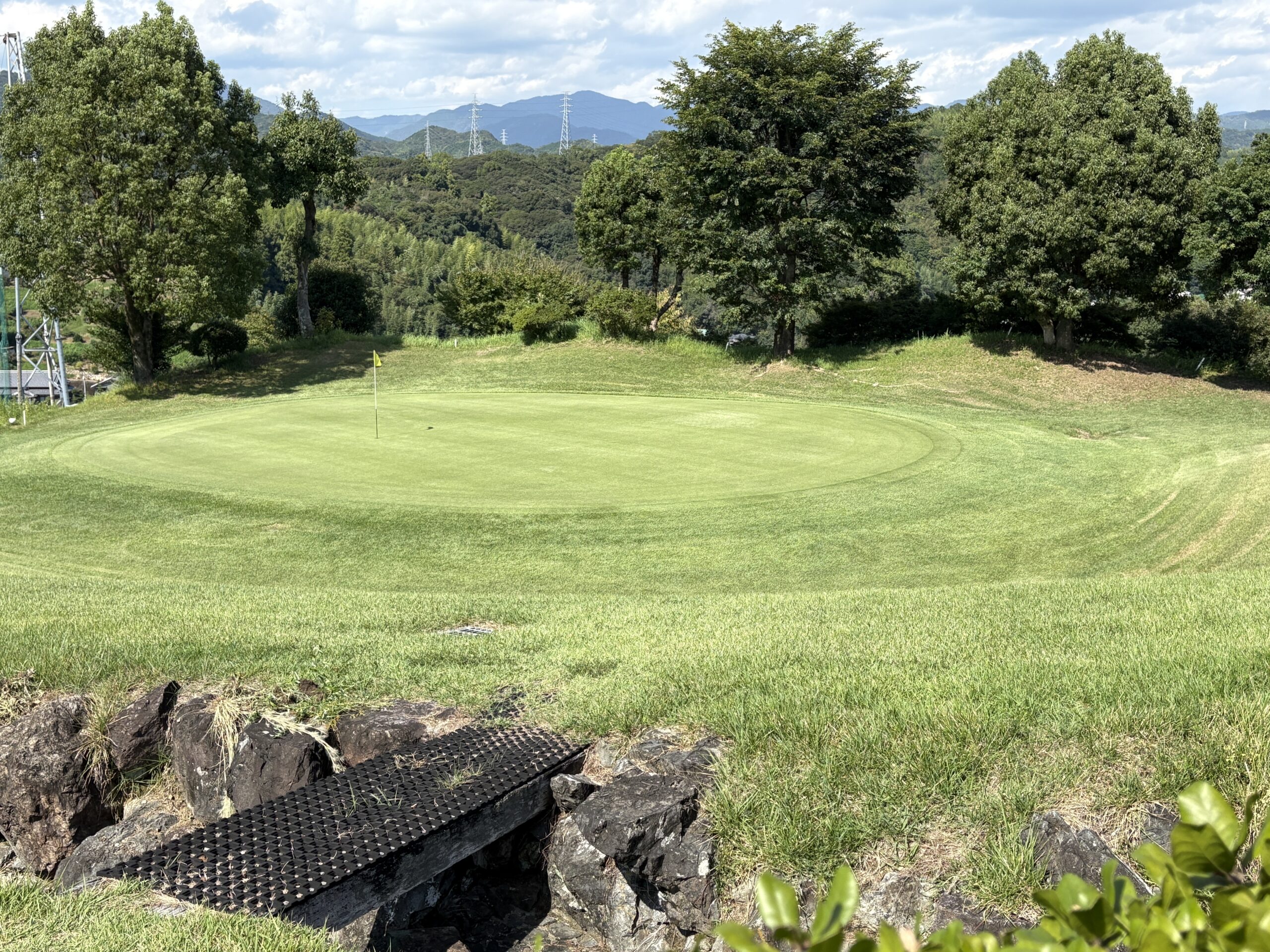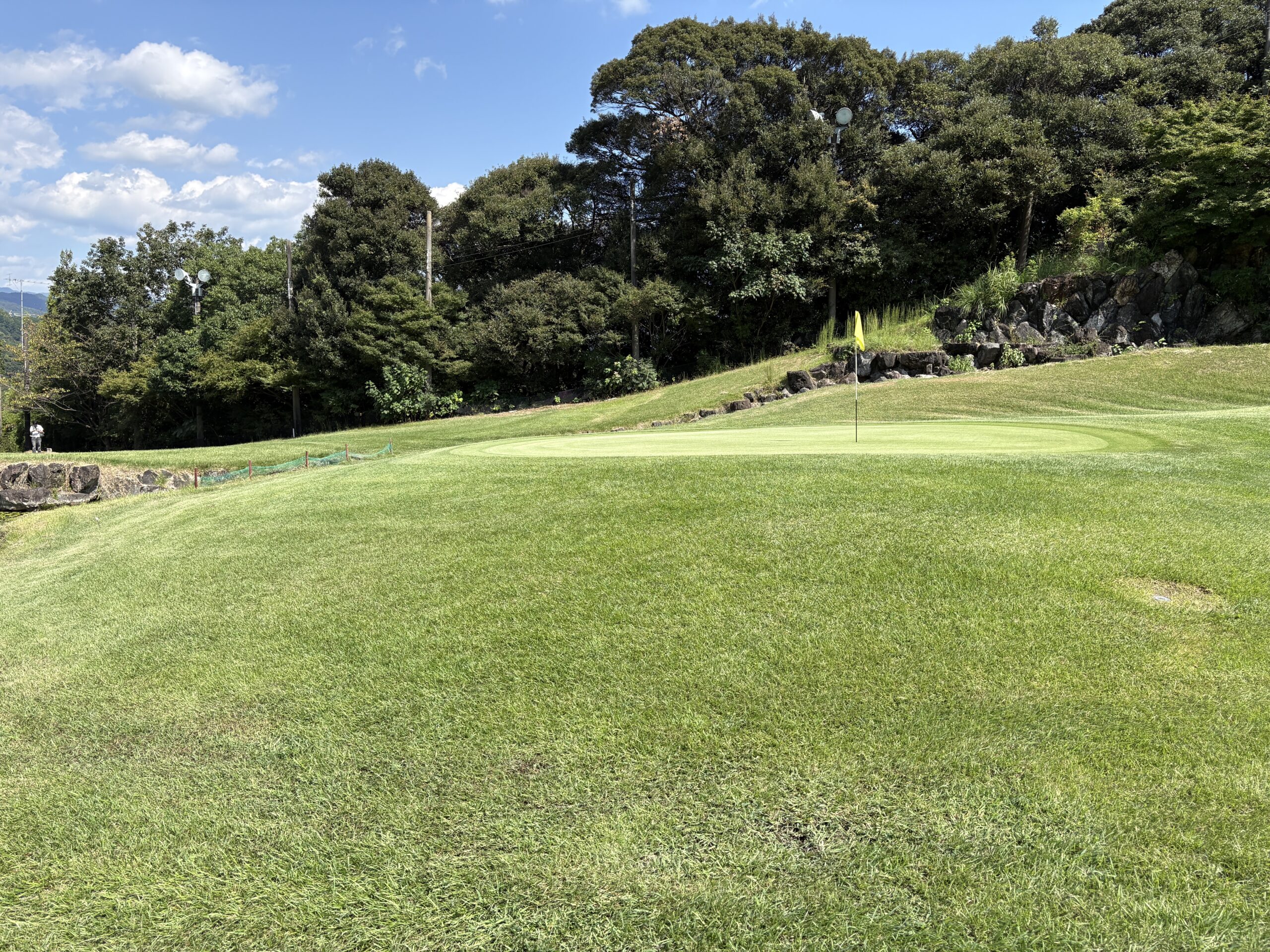 前を横切るクリーク(小川)が、プレーヤーの集中力を試す。左は山裾でOB、右は広く逃げ場がある。クリークをしっかりと越え、ピン手前から攻める冷静さがスコアを左右する。